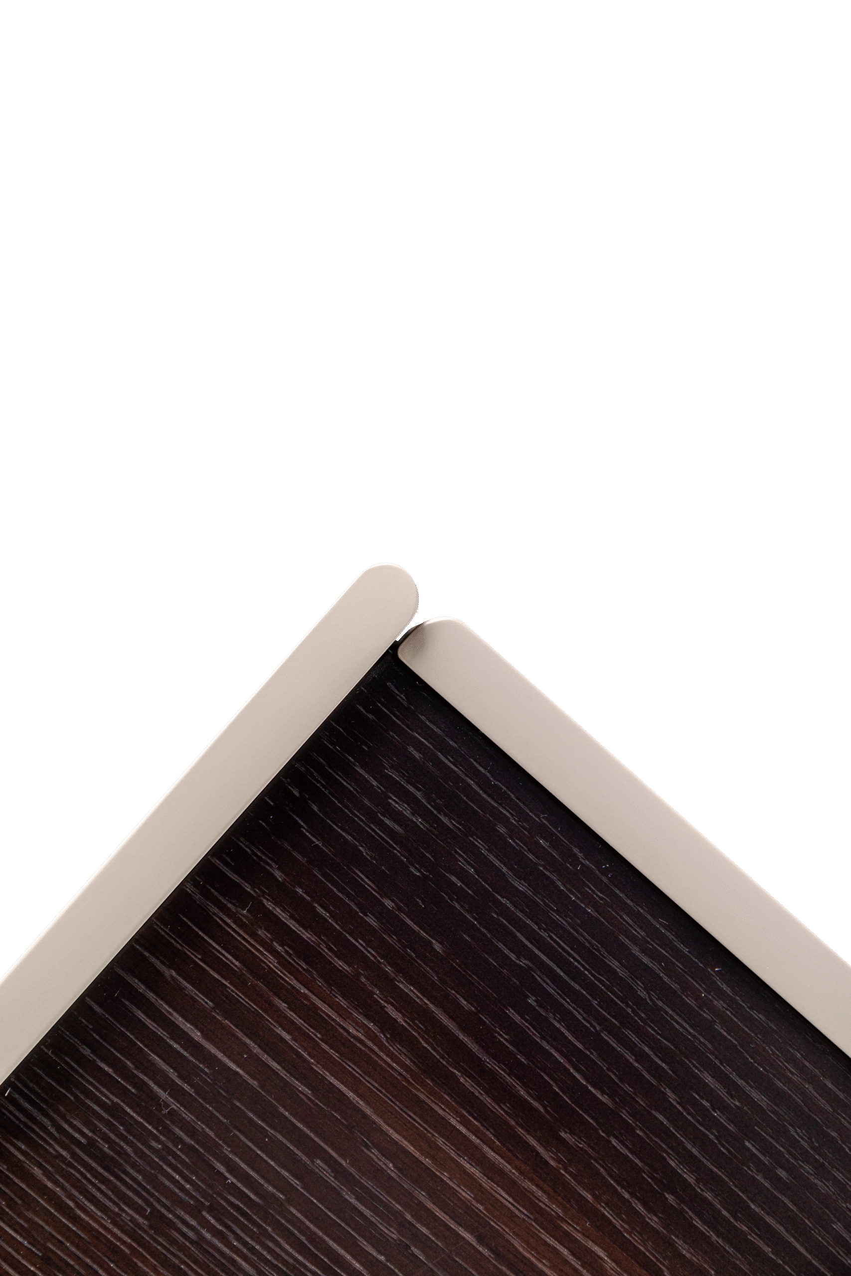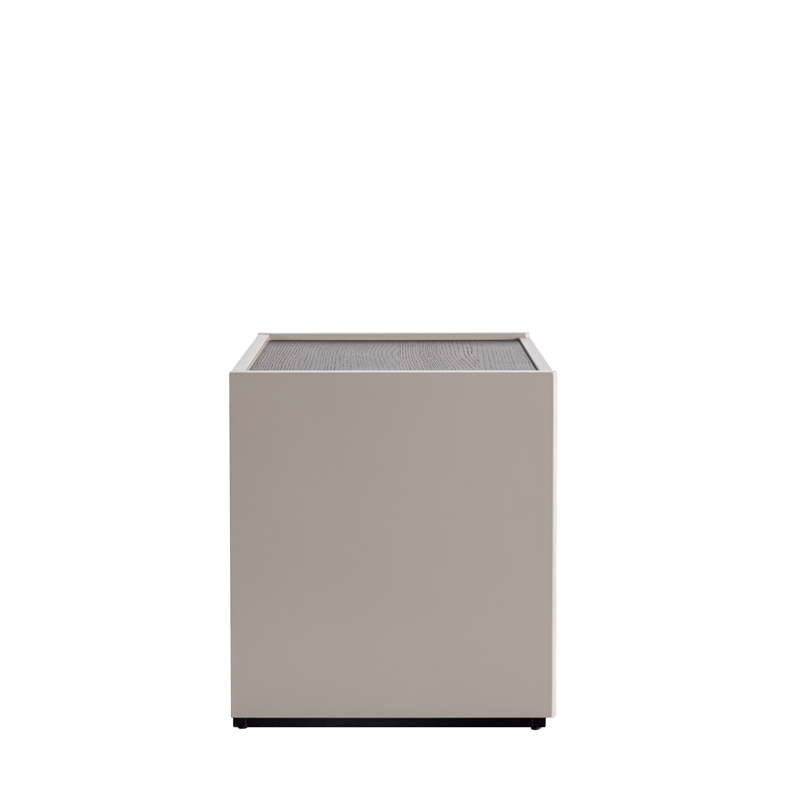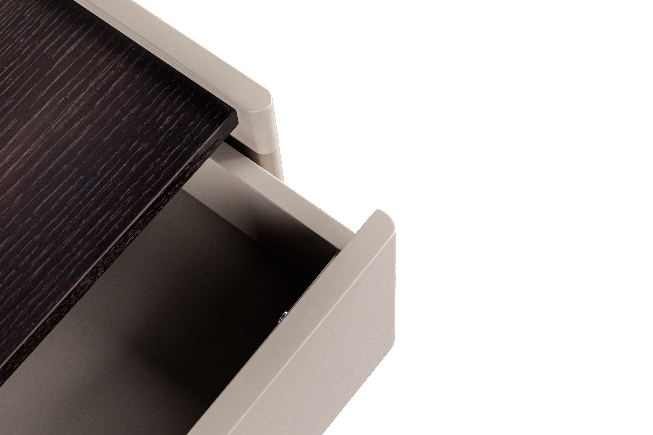 A sleek and modern nightstand with a minimalist design, featuring a smooth, neutral-colored finish and a spacious drawer for convenient storage. It also includes an open shelf at the bottom for added functionality