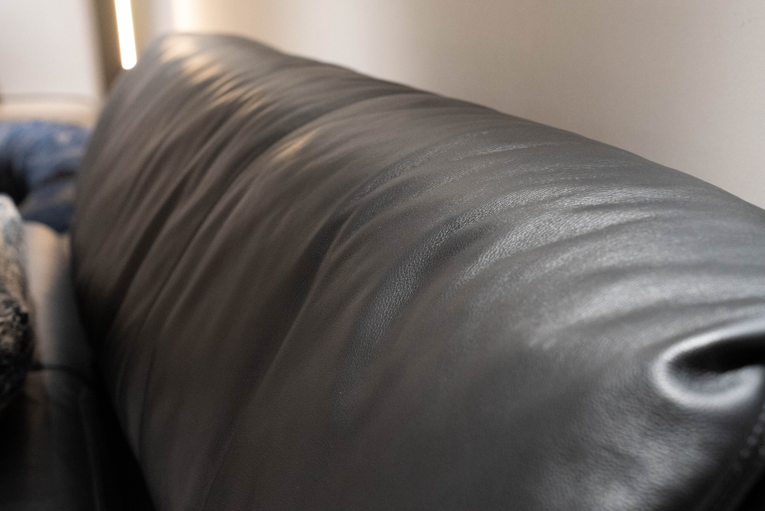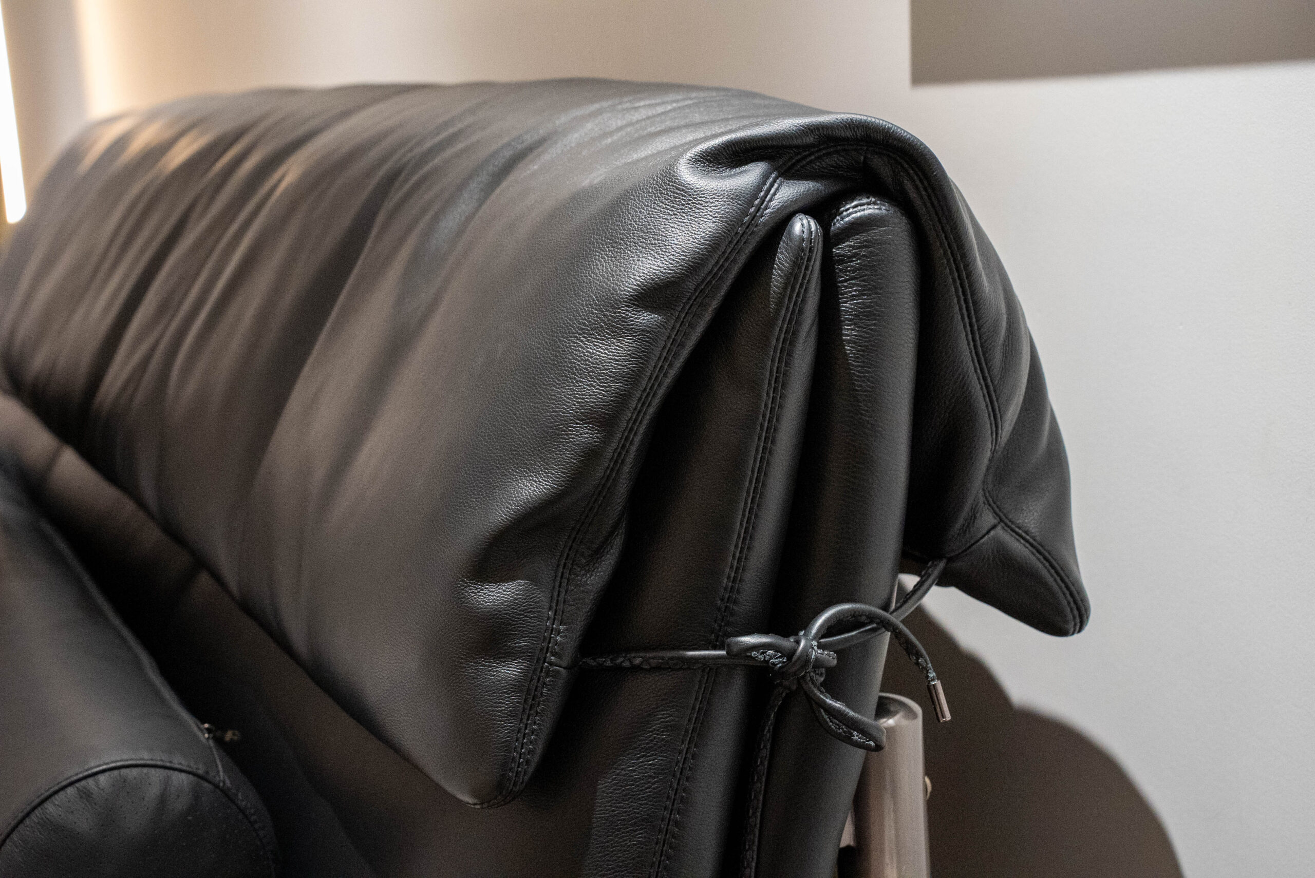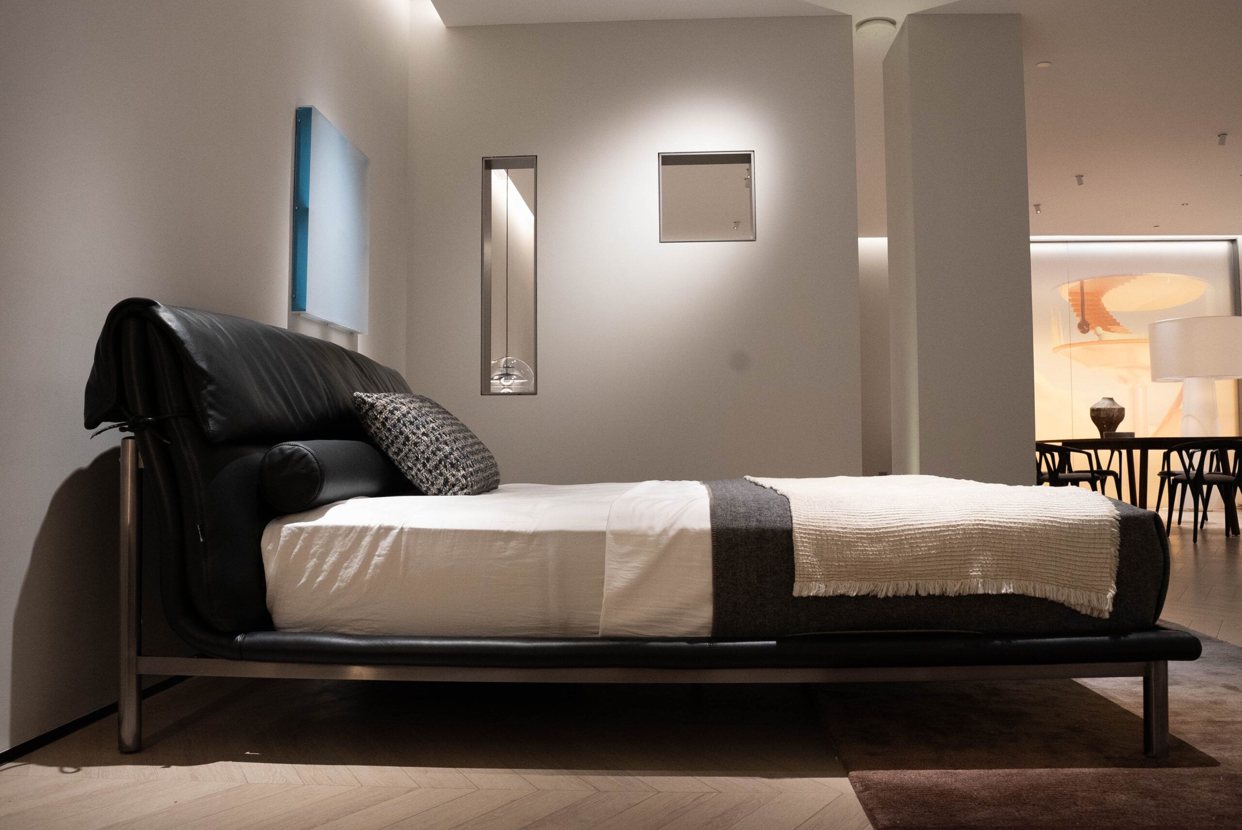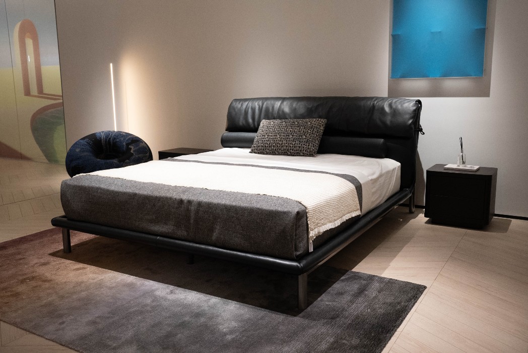 The combination of hard leather side and fabric, with full fabric wrapping around the front, back, and back of the bed.