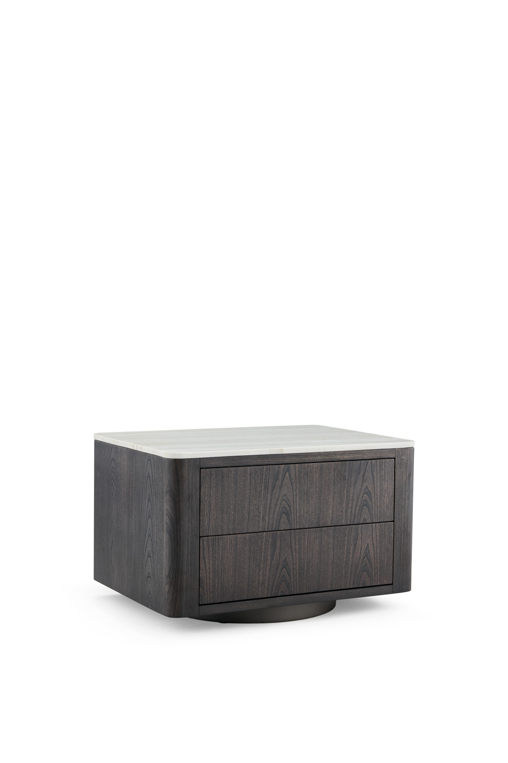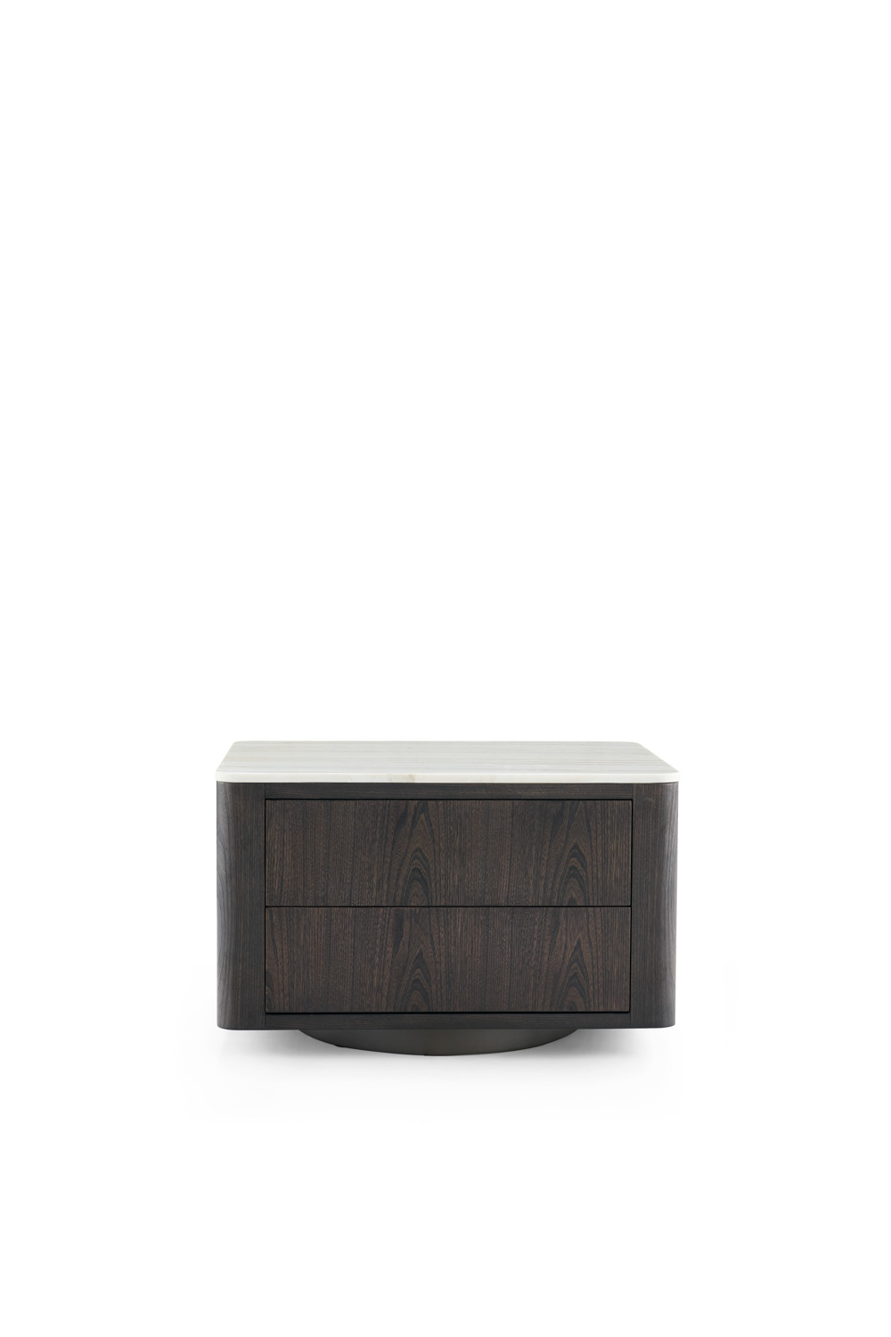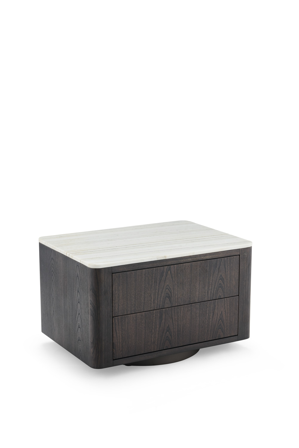 Rectangular nightstand with a dark-stained wood body and a contrasting light wood veneer top. Features two drawers with subtle grain detailing, supported by a rounded plinth base that adds softness and stability to its modern silhouette.