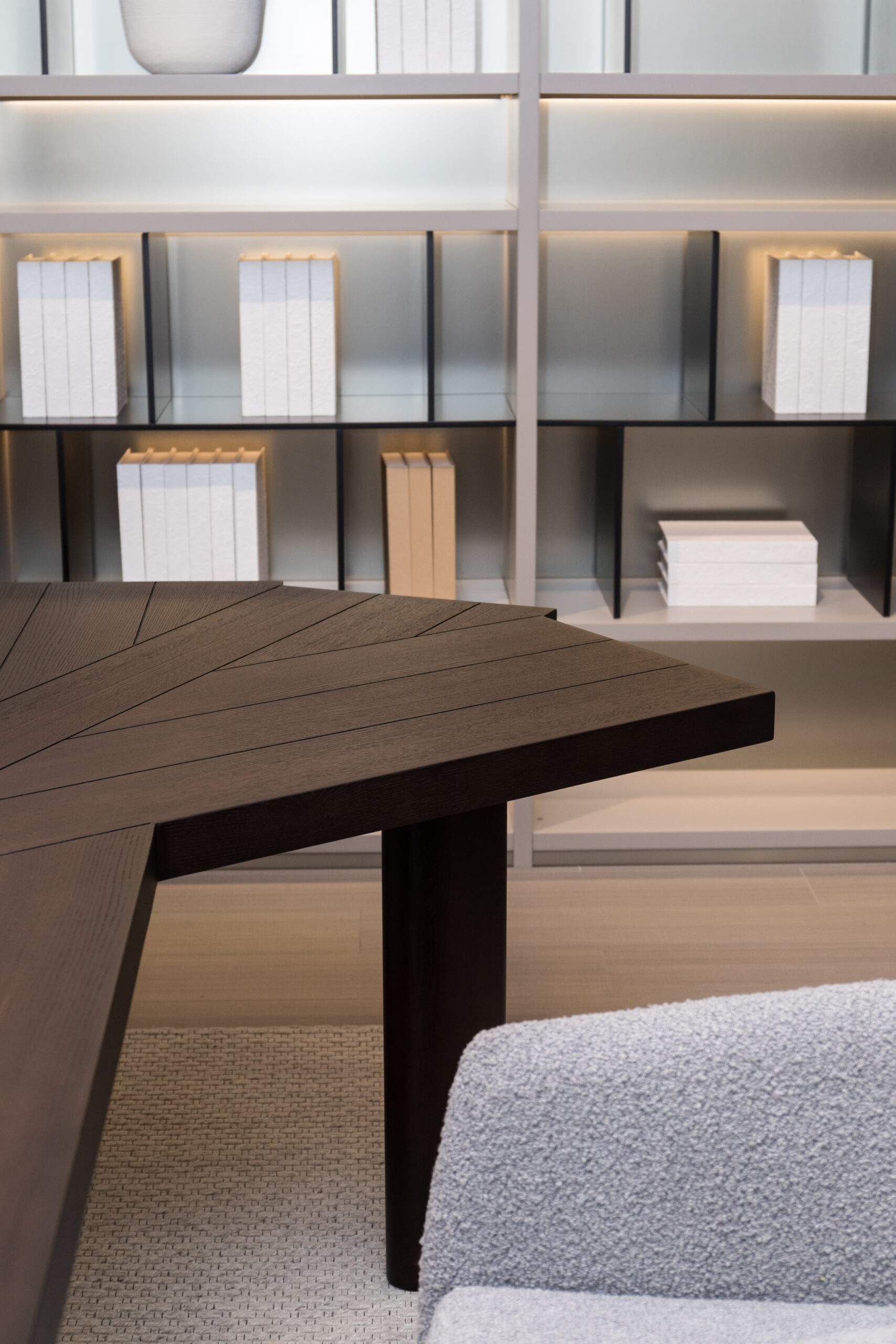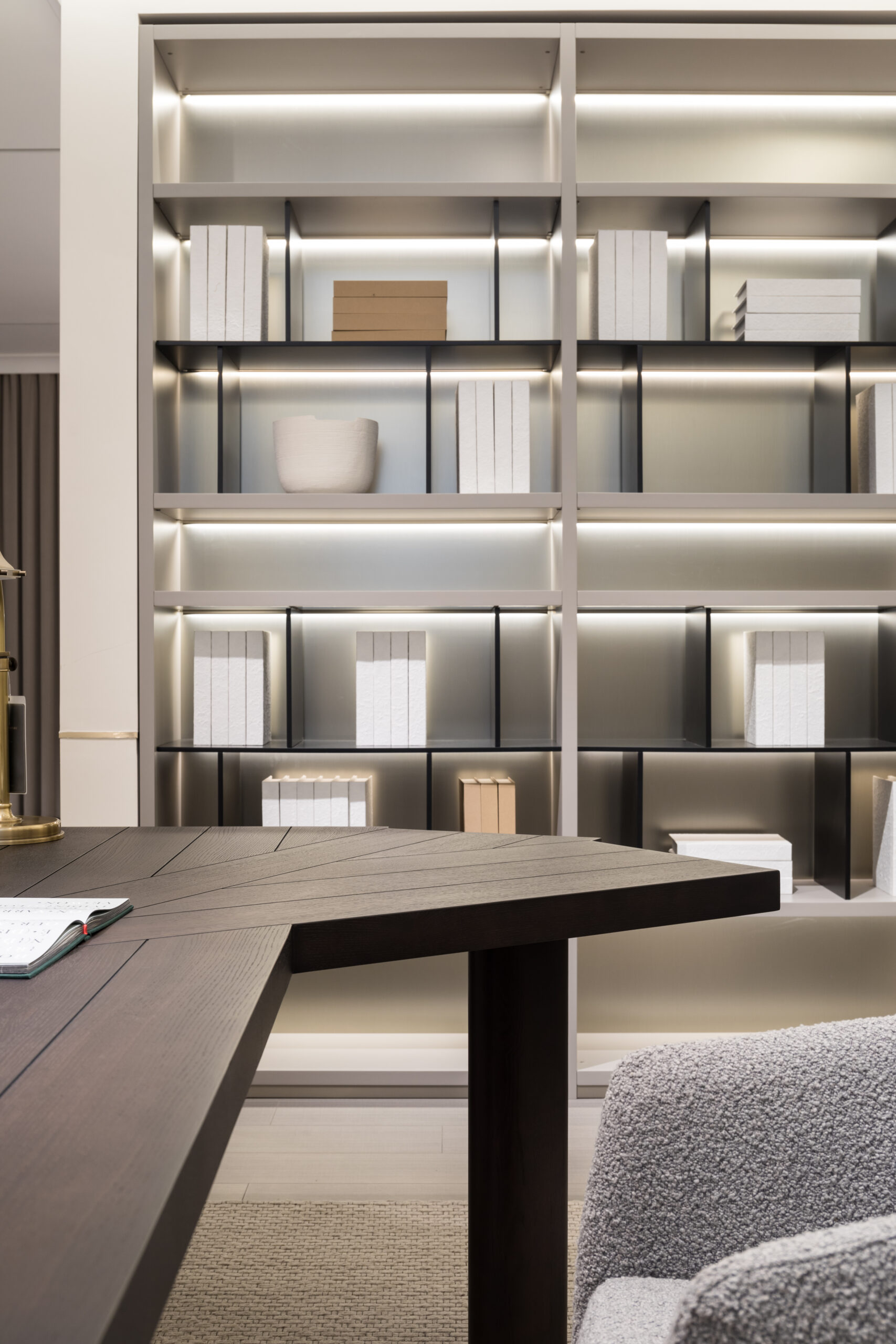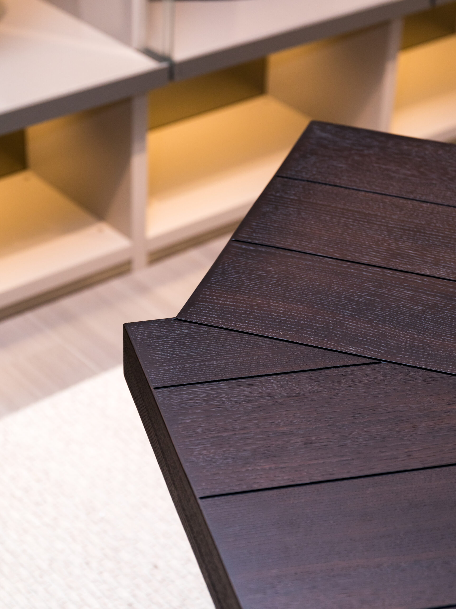 Home desk with a light wood top cladded with leather, smooth and softly rounded for a clean, modern feel.