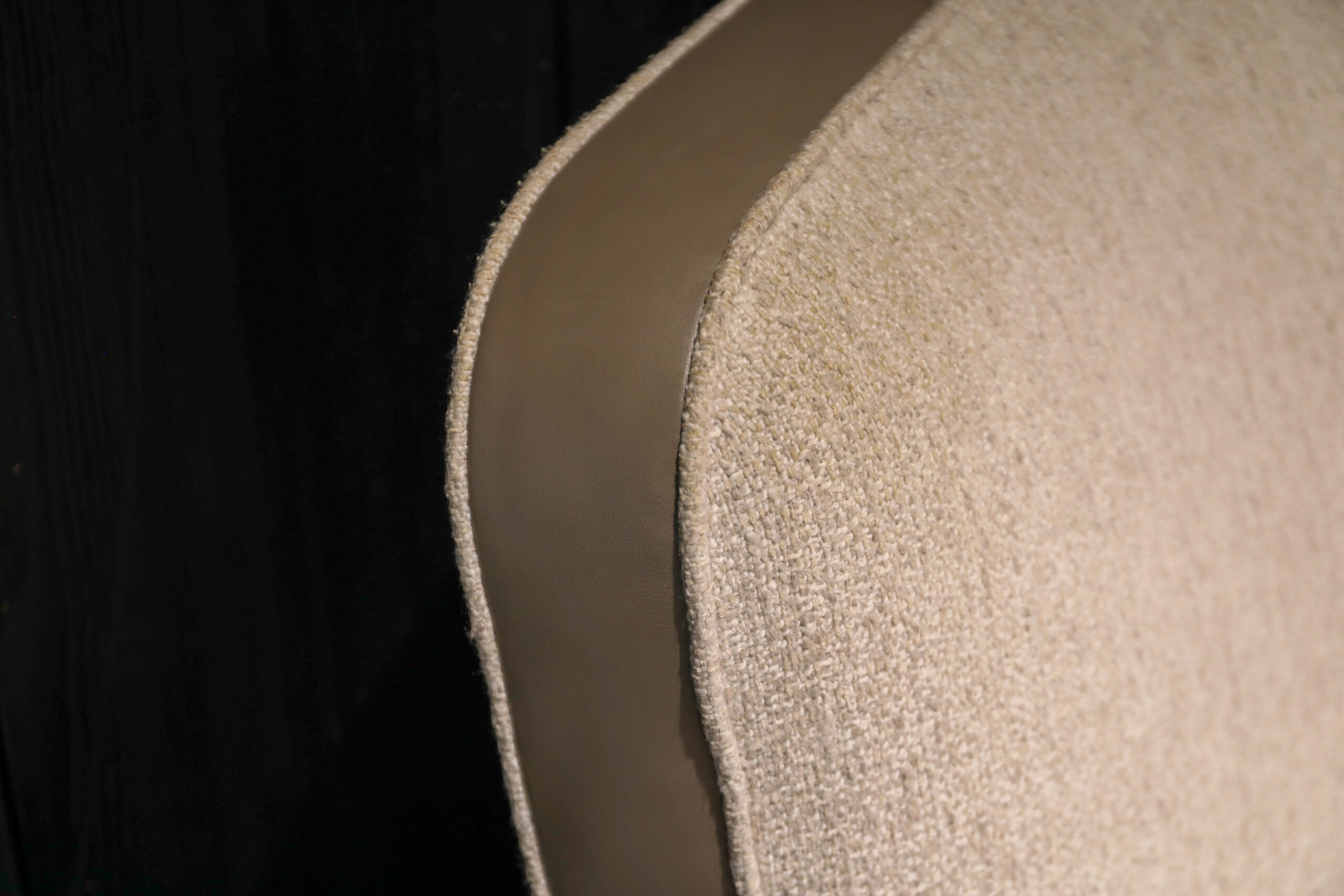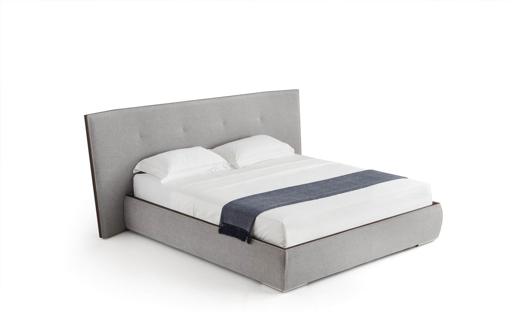 This modern bed features a streamlined, upholstered headboard with a smooth, clean finish that emphasizes simplicity and elegance. The low-profile design and neutral gray fabric create a contemporary look, while subtle stitching details add a touch of refined craftsmanship. The bed’s minimalist aesthetic makes it a versatile centerpiece for any modern bedroom.