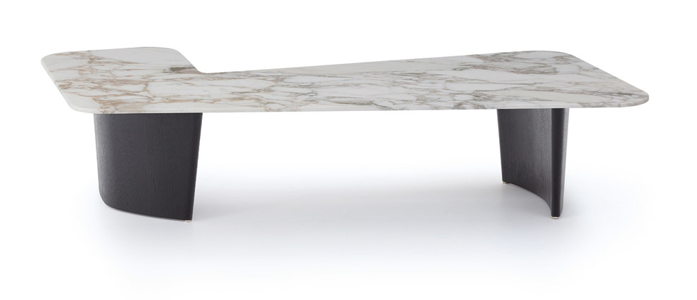 Irregular-shaped center table with a white marble top featuring soft grey veining. Supported by sculptural black wooden legs, its asymmetrical design adds a bold, contemporary edge to refined interiors.
